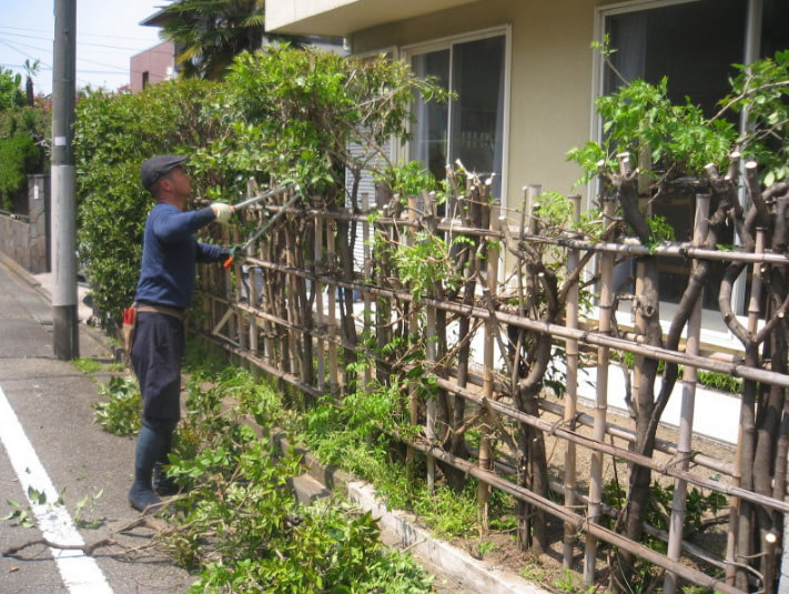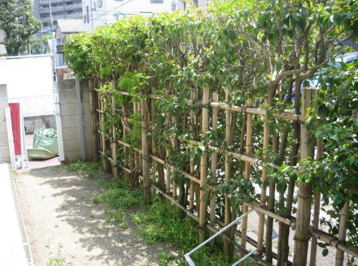 道路からおうちに出入りできるようにしたいとのご依頼です。生垣はネズミモチです。竹垣も撤去します。まずは枝を払い、太枝切鋏を使用します。次は四つ目垣を撤去、除草し、最後に伐根する計画です。
