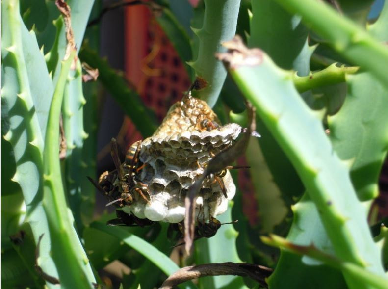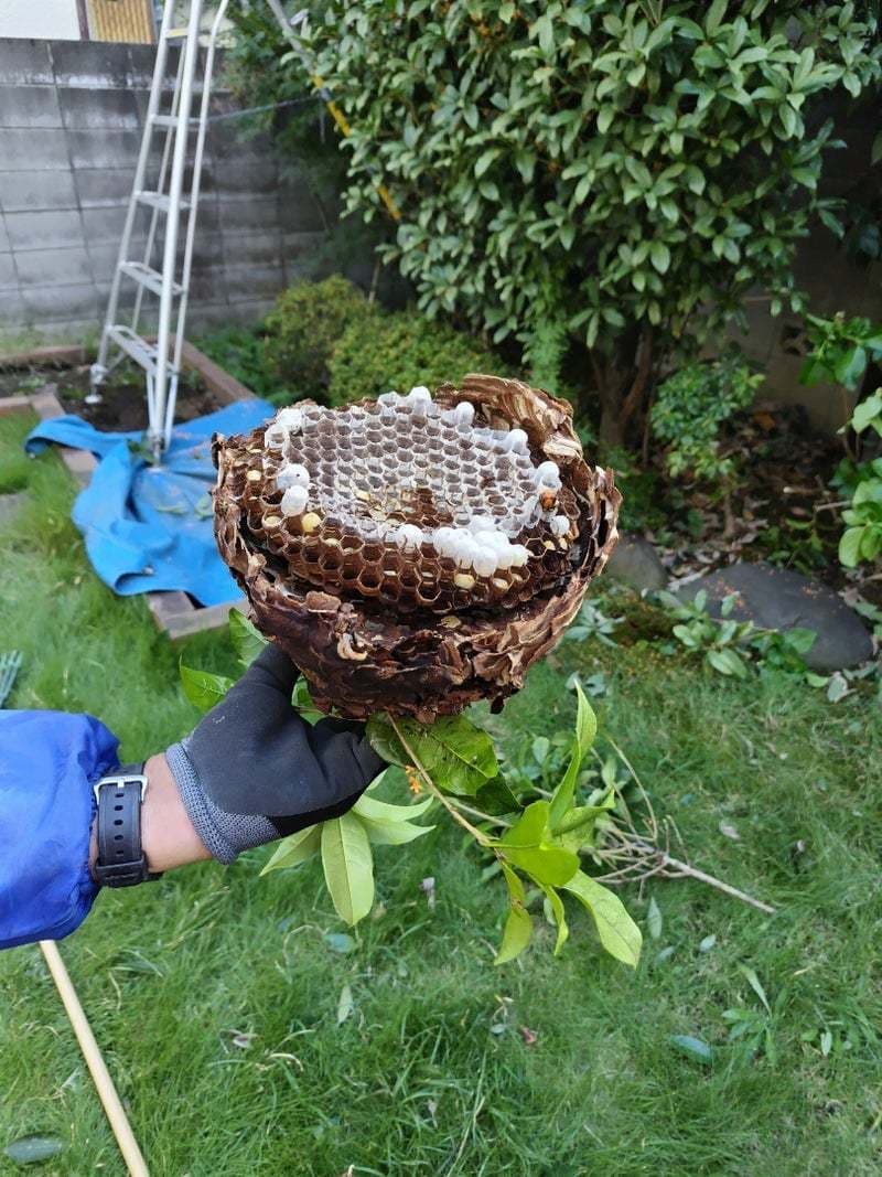 蜂は何もしなければ攻撃はしてきませんが、巣があるのを気付かずに、枝を揺らしたりすると攻撃してくる可能性があります。お手入れの際は十分にお気を付けください。