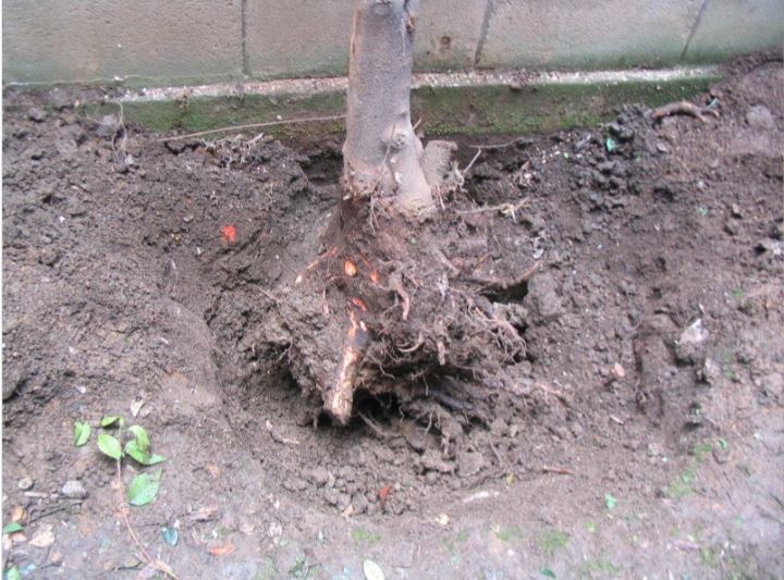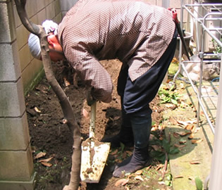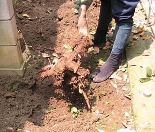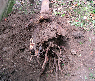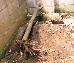さあ、作業開始です。まずは枝を払い、幹だけを残し、伐根する為の穴掘りです。穴掘り作業は根を切りながら、管などの地中の埋設物を壊さないように掘ります。 やはり、自然には敵いません。根はしっかりとしていて、地上部を支えるだけの力がありますので一筋縄ではいきません。