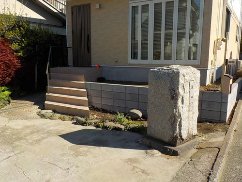 今回お世話になっているリフォーム屋さんから外構工事の依頼を受けました。既存のブロック塀が年数が経っていたこともあり、地震対策で低く積み直しました。さらに、家の外回りをデザイン。機能性を上げるために(名残惜しいですが)、石柱を撤去。お客様のお好みで、赤ポスト・クリーム色の伸縮門扉・スチールメッシュ型フェンス・インターホン柱を設置。花壇が作れるスペースも作りました。