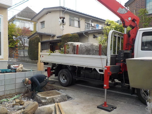 作業は山場を迎え、鬼門の石柱撤去です。今回は大型クレーン車で運びました。