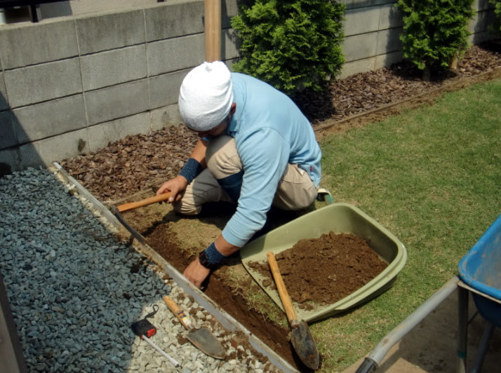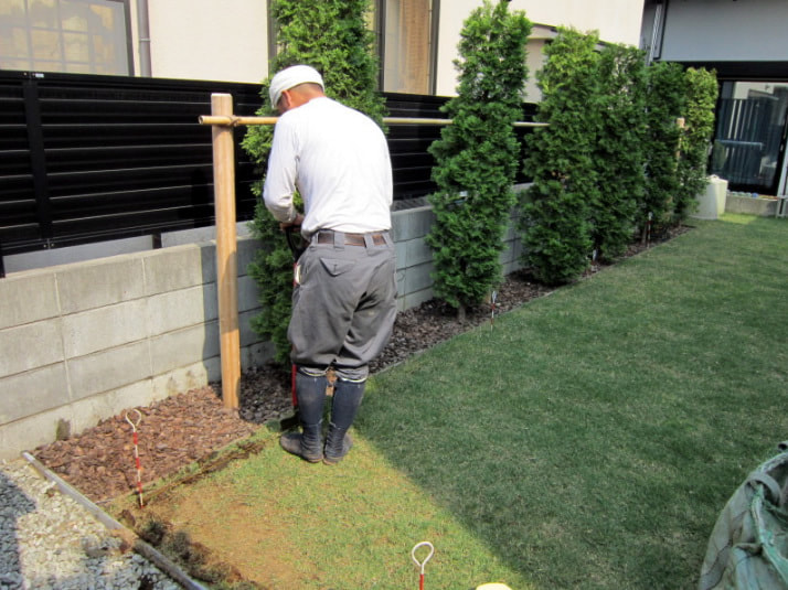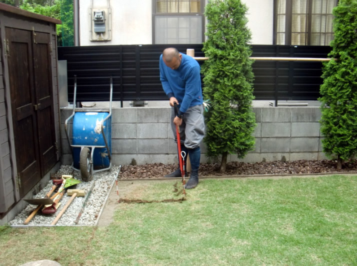まずは芝生を切ります。次に溝きり作業中です。溝を切っておくと、スムーズに排水が行えます。