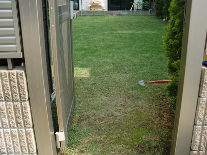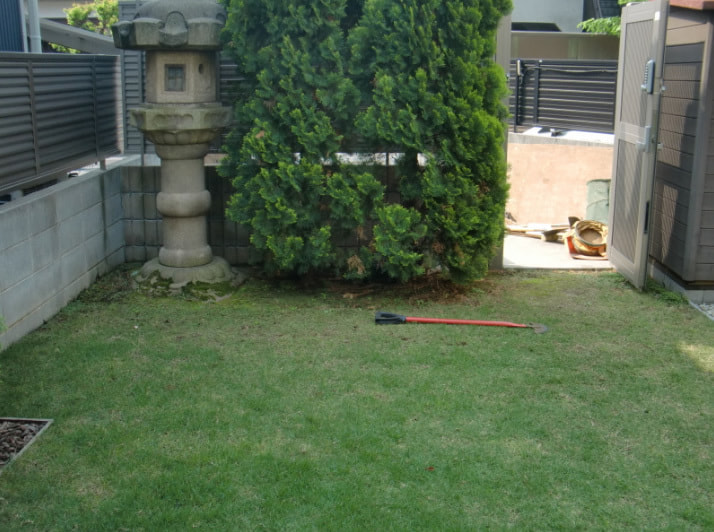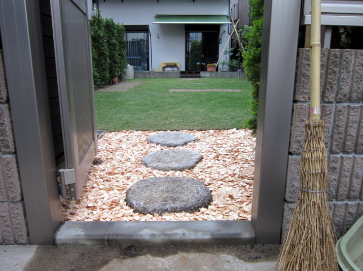 芝生を張り替え、芝床を川砂に交換します。あとは芝生を張るだけです。もし芝生の育ちが悪い場所はウッドチップを敷きます。ウッドチップが草を予防。チップが土に返りミミズも増え、土が良くなります。入り口付近には、飛び石を据えました。ありがとうございました。