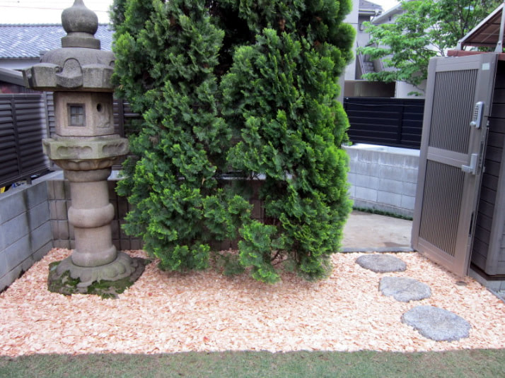 こちらは、芝生の張替えと溝きり、ウッドチップ敷きのご依頼です。