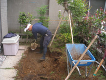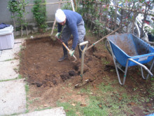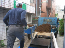土をスキ取り(土地を取る)します。ネコ(一輪車)で運び、そのままダンプに載せます。直通運転で楽チンです。