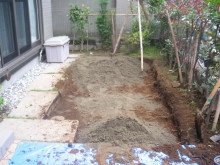 川砂には堆肥、腐葉土、黒土を混ぜます。タコ(木で出来た土や砕石などを突き固める道具)で転圧します。笄板(地ならしや整地に使う、木の板)で整地します。