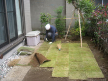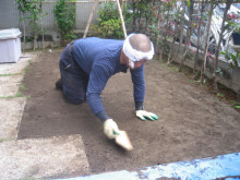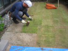 芝を張り、竹串で芝生を固定します。目土します。十分に灌水(水をあげる)します。作業終了です。