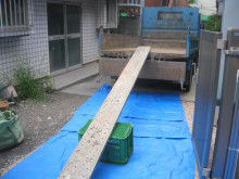 こちらは芝張替えのご依頼です。芝生に元気がありません。日当たりは良好ですが、排水が良くない為、今回は土を川砂に入れ替えます。今回は残土が出るので、2tダンプを用意しました。まずは残土を載せるため、ダンプに足場板を掛けます。