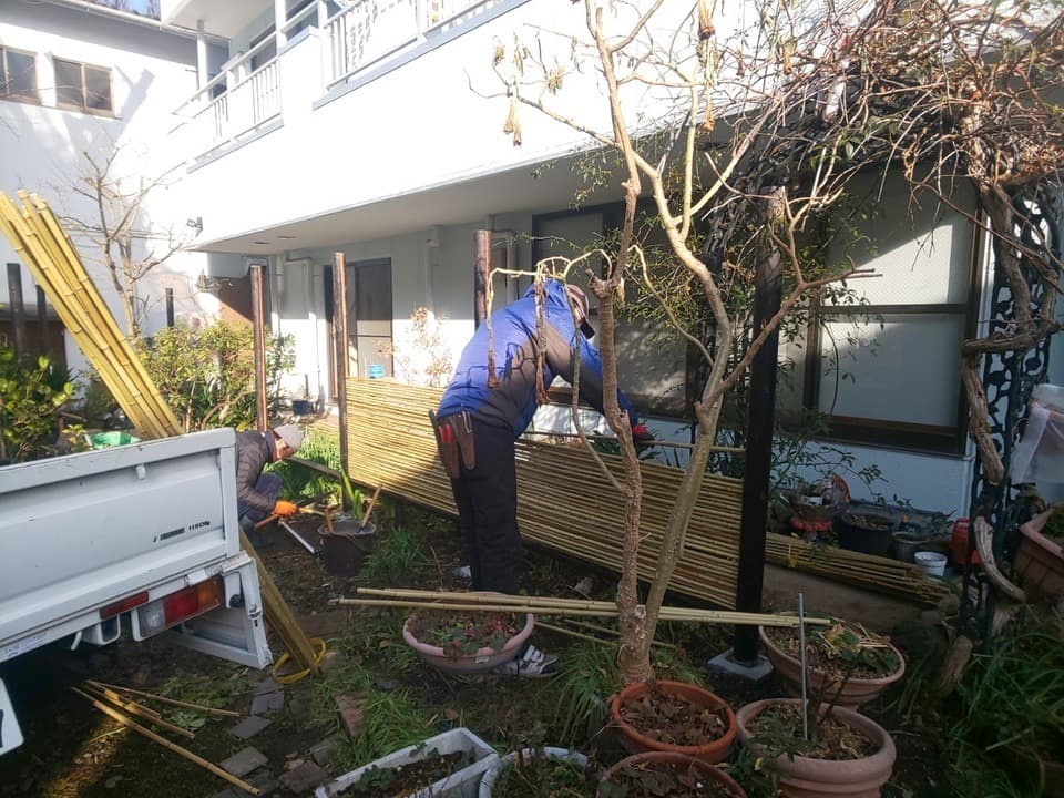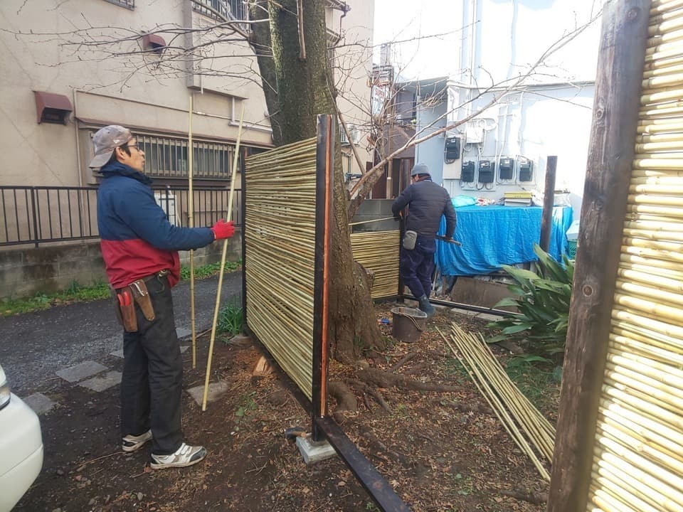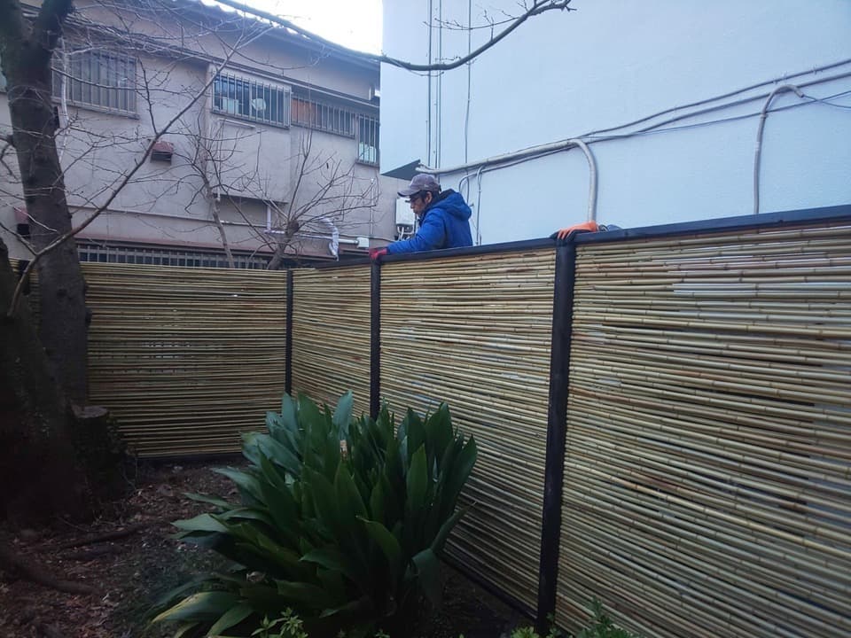 御簾垣とは、すだれの形状に似ているので御簾垣と呼ばれます。細かい竹を使うので、とても上品です。現場に入る前に、まずは下ごしらえ。会社の倉庫で柱の塗装・加工を行います。柱は、太さ9cmの杉丸太を使用し、防腐剤入りの柿渋塗装を行います。10年以上は腐りません。