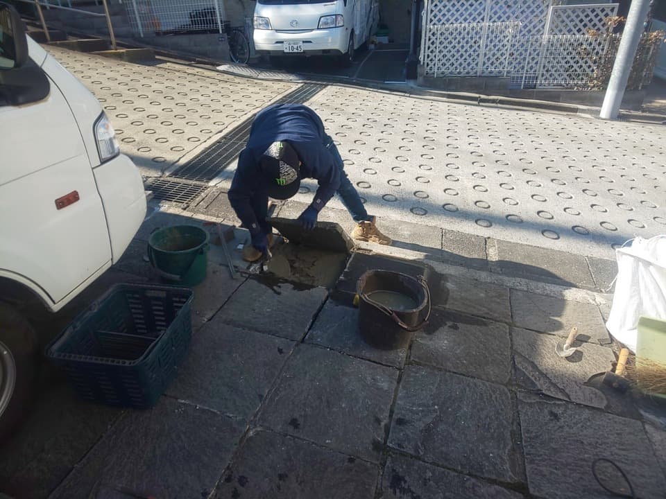 車庫の敷石の補修工事を依頼されました。年数が経ち、敷石が動いてしまうとのこと。敷石を外し、下地を整地し、モルタルで固めました。