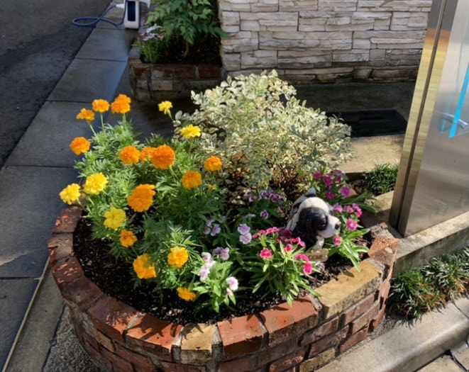 季節の変わり目など、花壇のお花を新しい花へ植え替てほしいご依頼がございます。土も新しい土に変えます。玄関周りが華やかになり、お客様にも喜んでいただけました。