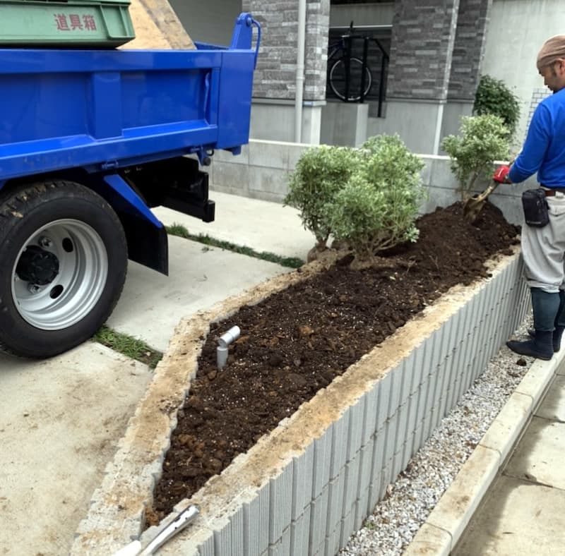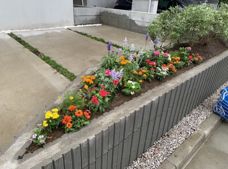 先日、戸建て玄関前の花壇の植え替えをしました。奥には斑入り葉の馬酔木を、手前には花々を植えました。春にはチューリップを植えたいとプランがあるそうです。四季折々の草花で、ガーデニングを楽しんでいただけたらと思います。