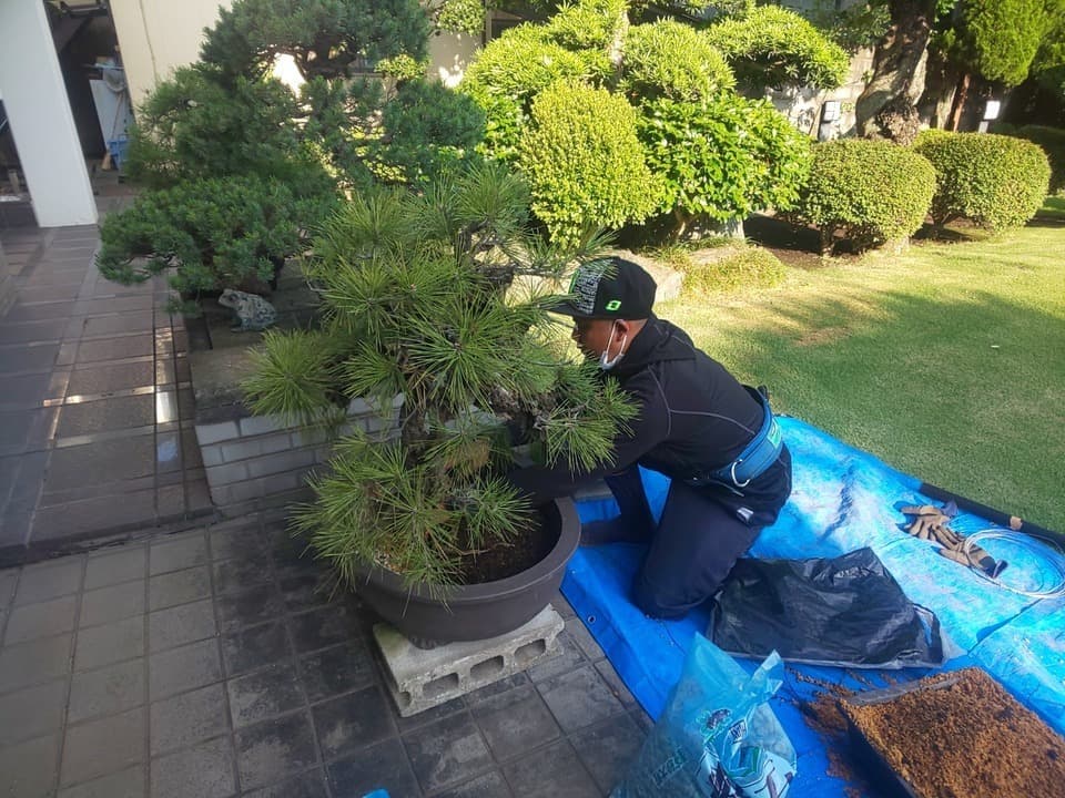 黒松は、男松とも呼ばれ、力強く、育てやすく、陽が好きな木です。その黒松が倒れてしまい、鉢に植え替えたいとのこと。お庭の雰囲気に合わせた大きな盆栽鉢を用意。赤玉土、桐生砂、培養土をブレンドし、植え替えました。鉢へ植え替えしたらいいかお悩みなら、弊社職人が相談にのります。お気軽にご連絡ください。