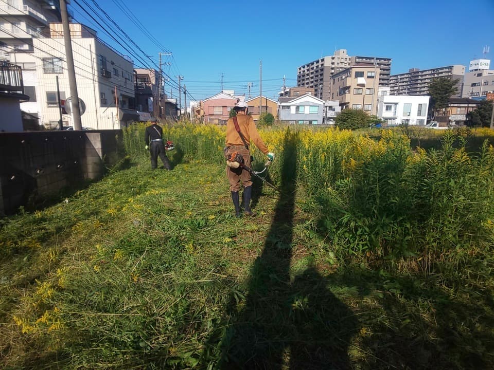 セイタカアワダチソウは、秋、黄色の花穂が目立つ背の高いキク科の多年草です。空き地なので、草が伸び近隣に迷惑がかからないようにと依頼されました。エンジンの機械式草刈り機で刈りました。繁殖力が強いので、7月・10月の年2回草刈りをしています。安心して冬が越せるとおっしゃっていただきました。