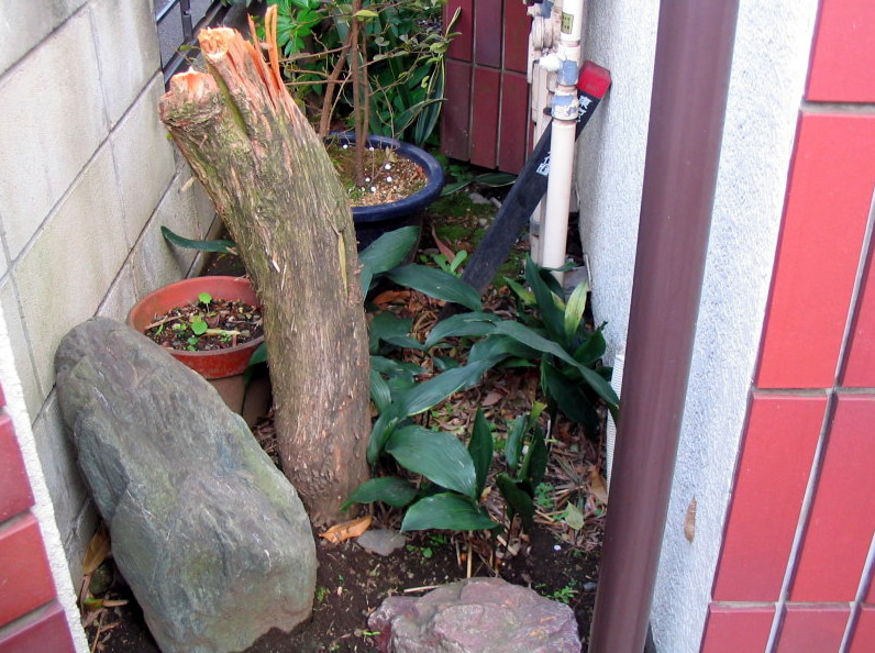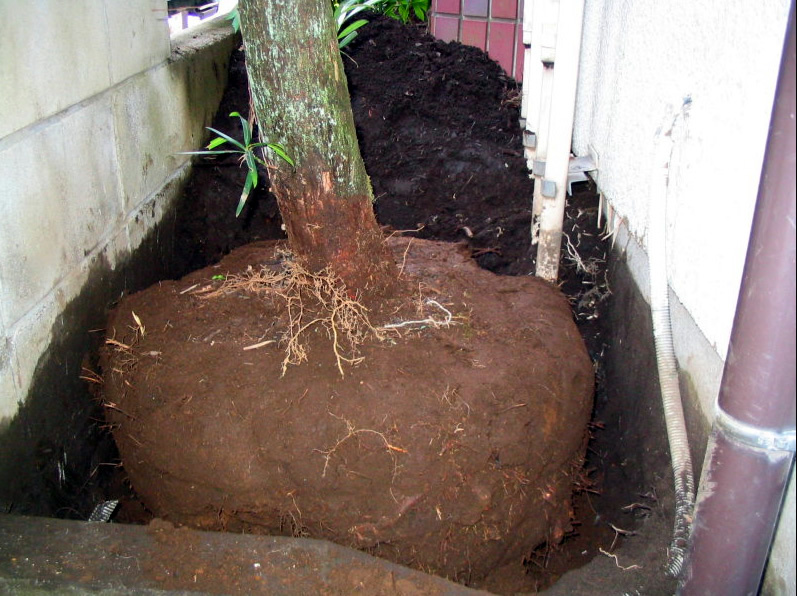 まずは、伐根です。今回の伐根は、幹が太く根がしっかりしていたので、時間を要しました。寸法を測り、枝ぶりを確かめ、上手くその土地に馴染む木を選び、植え込みます。木が大きくなれば、その分根も大きくなり、かなりの重量になります。