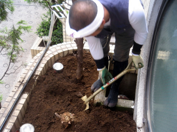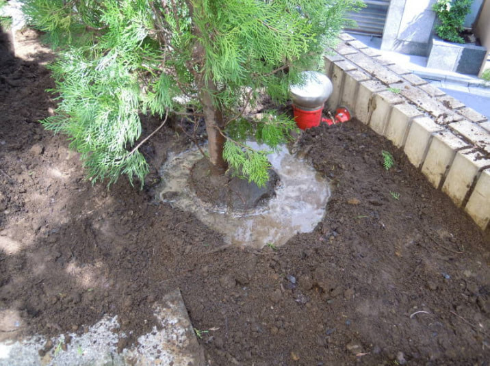 今回は枯れてしまったコニファーをエレガンテシマに植替えのご依頼です。新しく植栽するエレガンテシマです。まずは残っている根を掘り取ります。腐葉土を混ぜます。たっぷりと水をあげます。水決めです。支柱に使う棕櫚縄と、スギ皮を用意し、支柱を立てます。最後に棕櫚縄で結んで、作業終了です。