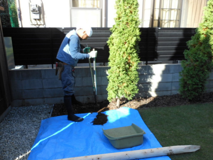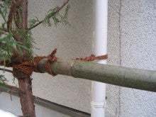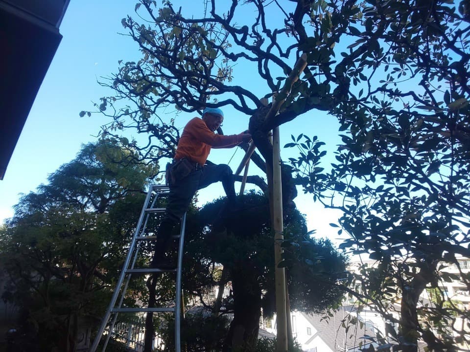 お客様は古木(高木)で倒れるのがご心配とのこと。古くなった丸太を新しくしました。さらに3本の防腐剤入りの杉丸太で、しっかり支えています。思い入れのある古木。元気に育ってくれることを祈ります。