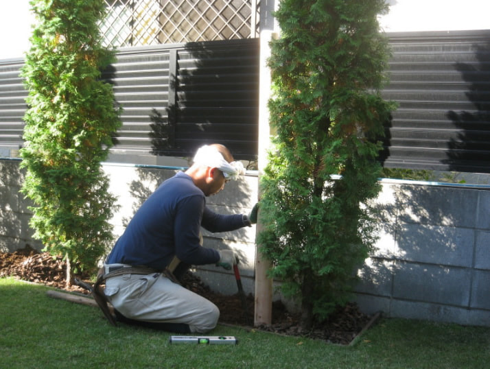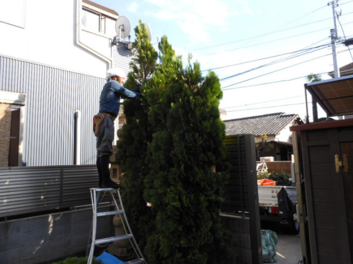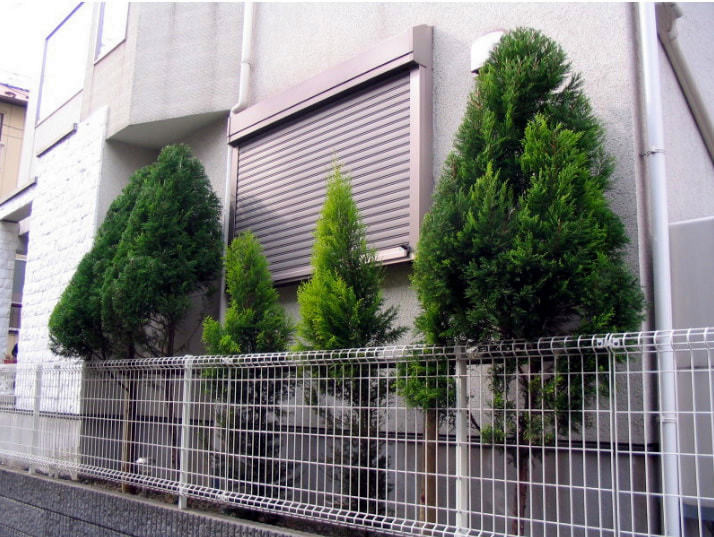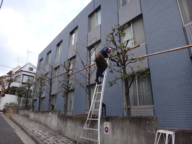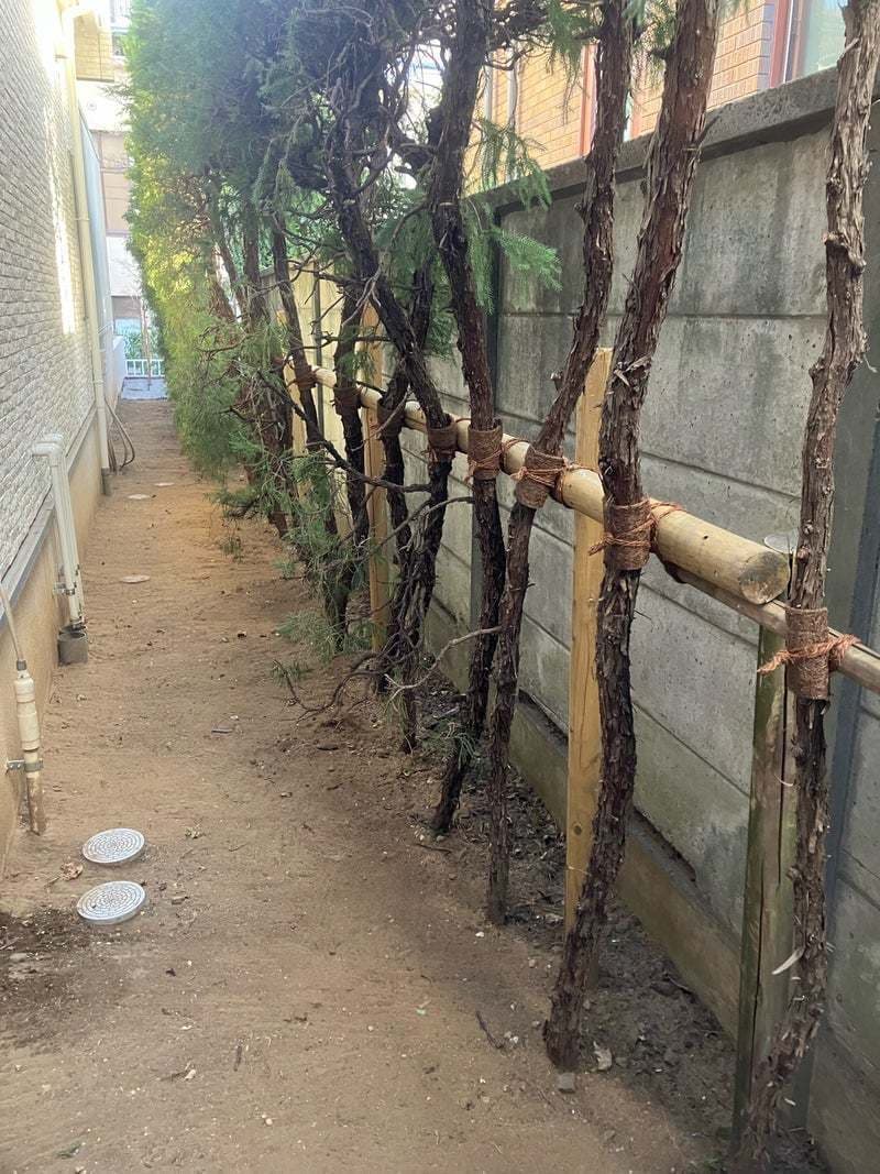 建物と塀に挟まれた細い通路に並ぶ樹木。それぞれに支柱を設置。