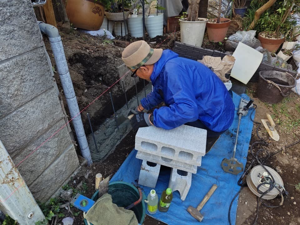土が漏れないようブロックを積み、土留めをしました。花壇は土砂を防ぐ役割もございます。