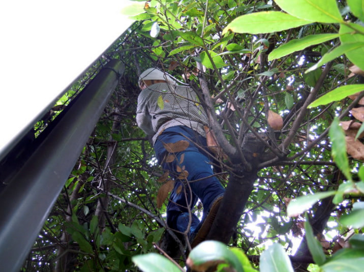 月桂樹の生垣は立派です。今回は高さを抑え剪定しました。