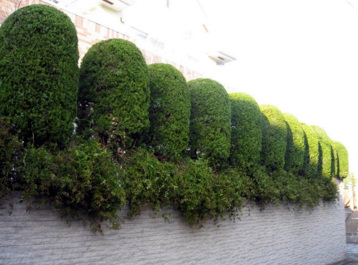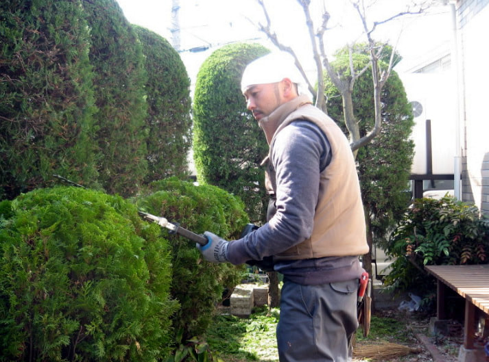 こちらは、コノテガシワのお手入れのご依頼です。今回は、電動のトリマーを使い、刈込み鋏で仕上げます。