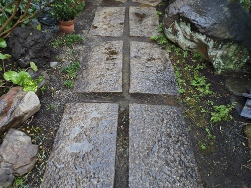 年末間近、お庭のお手入れ。作業後に水打ち作業。植木や土にたっぷりとお水を含ませ、庭石や、飛び石にも水打ちです。行われたあとの景色は、見た目にも清涼感があります。