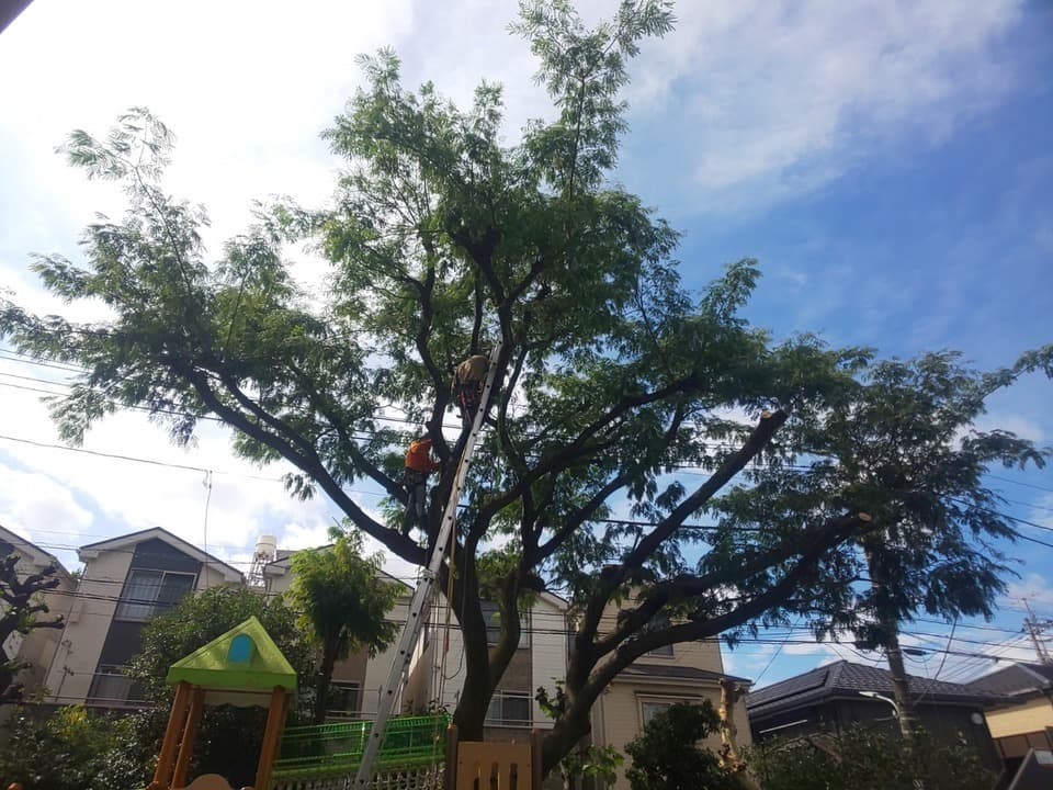 こちらは区の指定保護樹ネムノキの剪定のご依頼です。自然樹形で、とても立派で格好が良いです。しかし、道路側にだいぶ枝が伸び、電線にも引っ掛かってしまい、お向かいのお宅にもご迷惑が掛かってしまうので、道路側を強く剪定することになりました。お庭側は枯れ枝を落とし、樹形が乱れない程度に、道路側とのバランスを取り弱く剪定します。