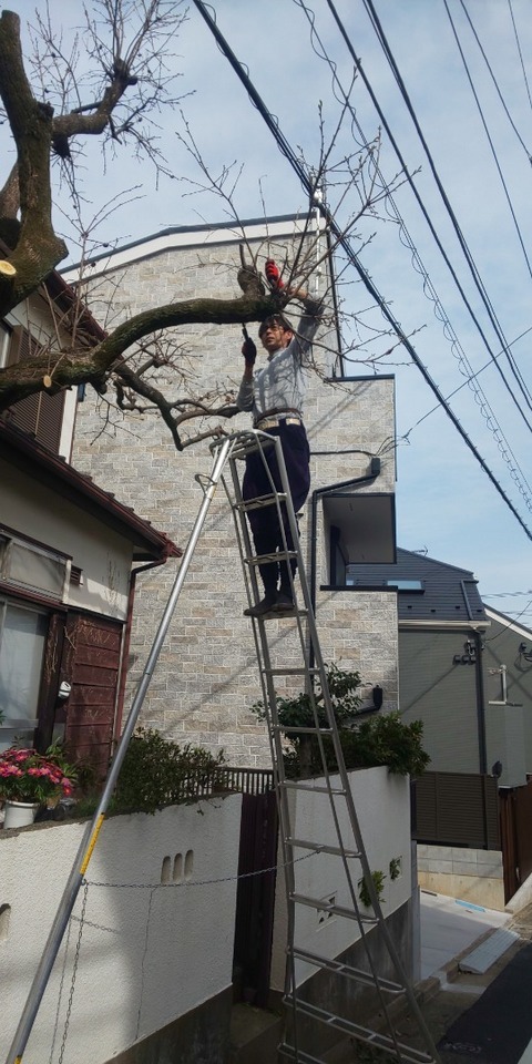 電線に枝が伸びているので心配とのこと。道路側の枝を、剪定しました。お客さまの落ち葉の掃除も楽になりました。