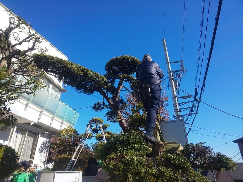 庭師、山崎の刈込み作業中。まずは、電気バリカンで形を整え、仕上げは、刈込み鋏で全体を刈込みます。