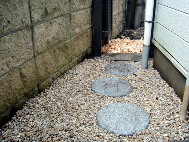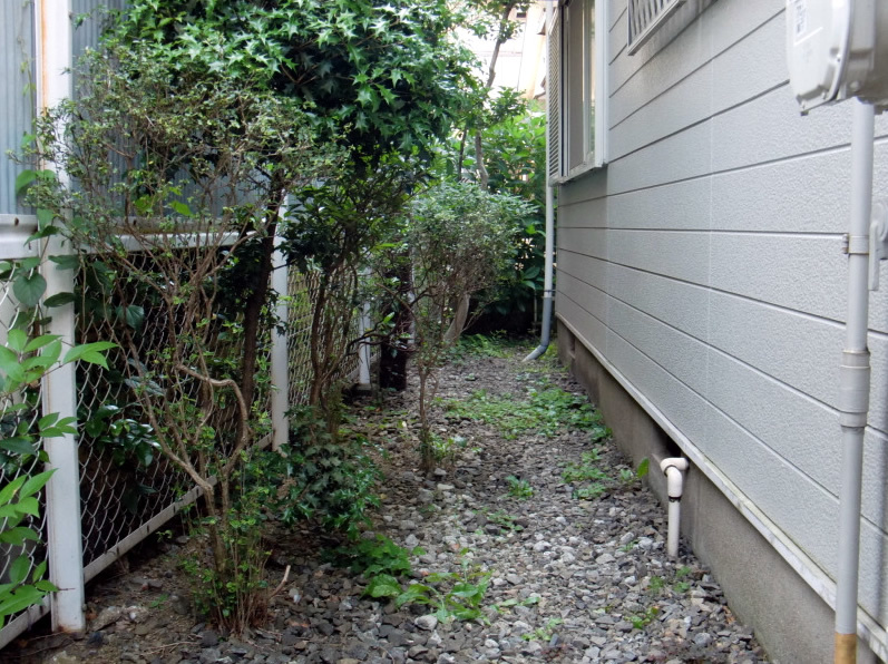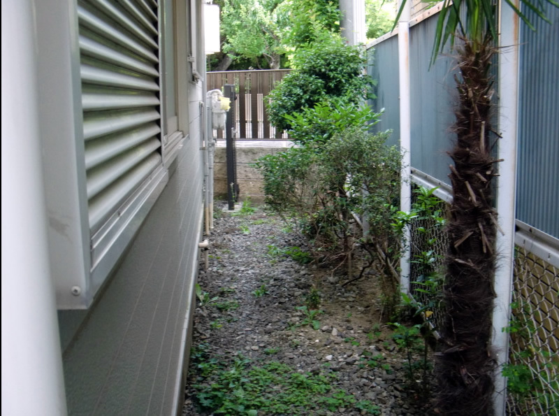 玄関と犬走りがあります。柿の木の新緑が綺麗です。