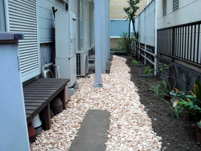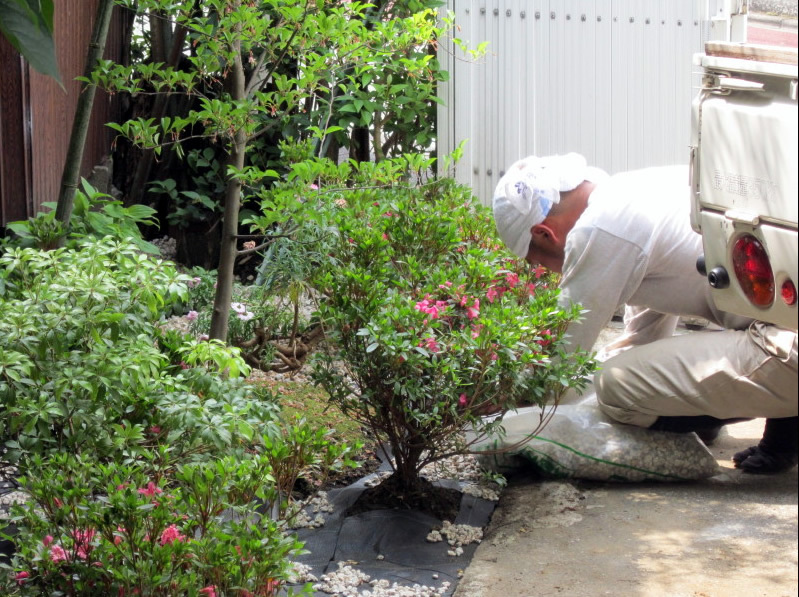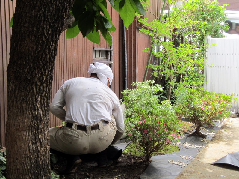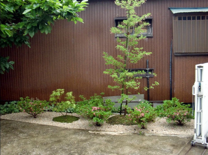 既存の低木や苔は移植し、新たに本柚子、エゴノキ、サツキ、アセビを植栽しました。