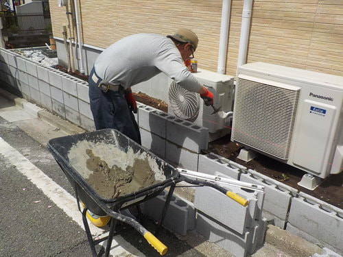 今回外構のベテラン、スグルさんが総責任者。指示を出しつつ、三段ブロック積み作業中。じっくりと綺麗に積めました。今日も気の利くカズさんはフェンスを設置しました。