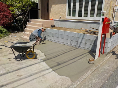 ミキサー車でコンクリートを流し込み、コテをうまく使い土間を仕上げます。雨の影響があるので、勾配には気を使います。数時間後、赤ポストとインターホン柱を設置。均衡に保てるよう慎重に作業しました。手先が器用なミッチャンは白い伸縮門扉を担当。