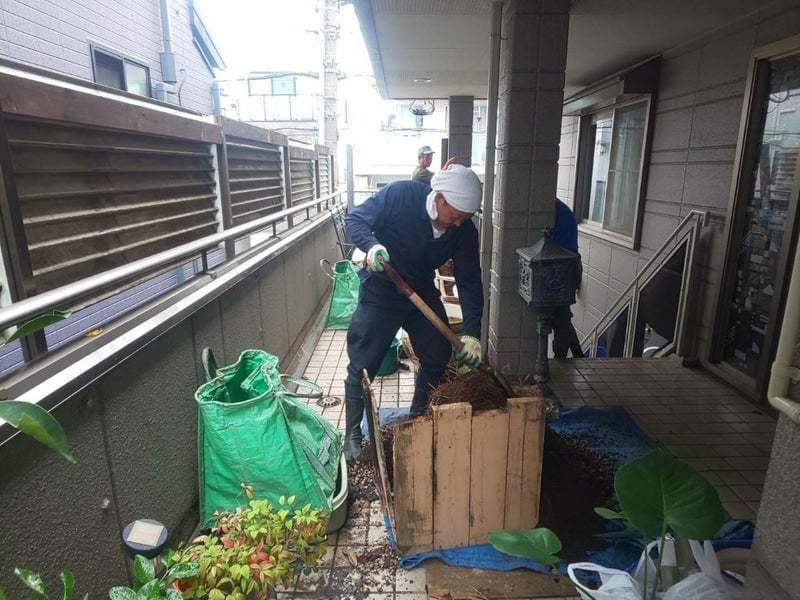 主な作業内容は 1、花壇の剪定 2、伐採伐根、植え替え 3、通路際の砂利敷き 4、ラティスの張替え 5、植木鉢の植え替えです。