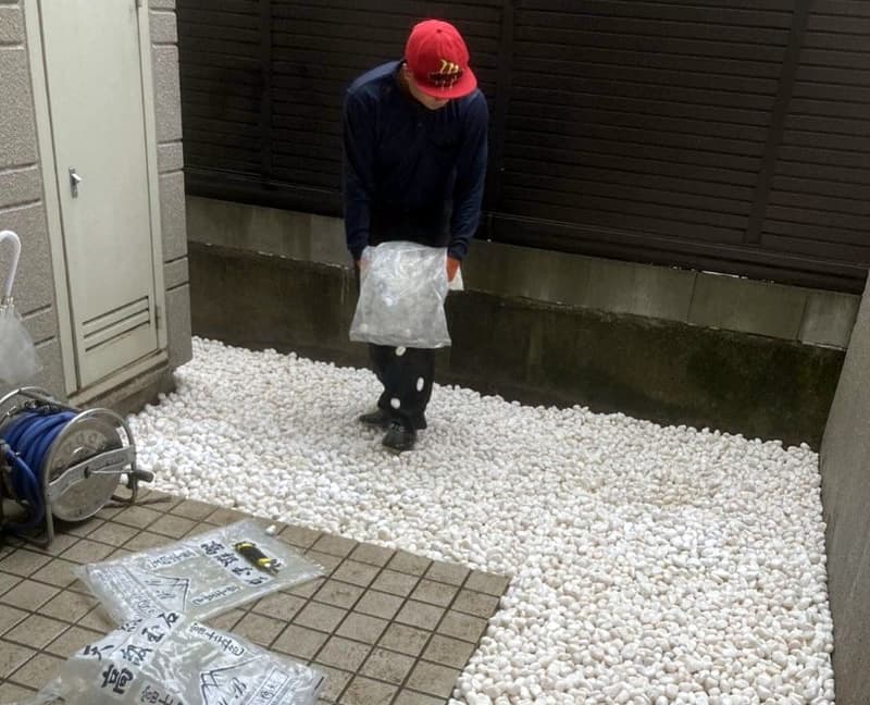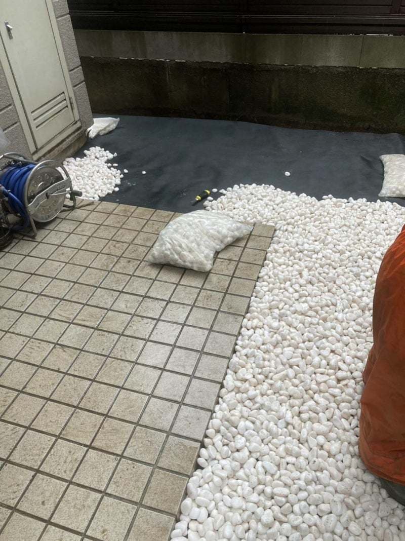 シートの下地が見えないように一面にしっかり砂利を入れていきます。砂利が入ると一気に雰囲気が変わりますね。