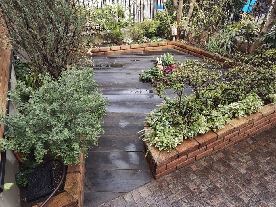 お庭に敷かれた枕木を交換