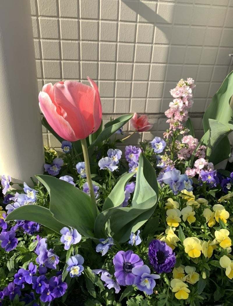 パンジーは咲き誇り、チューリップも開花しました。ところがこのチューリップ、植えた球根は10球。全て開花しましたが、その半数が切り盗られてしまいました。残っているのは3本。でも、ひとつの花が大きいので3本でも見応えあります☆