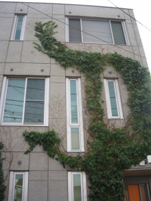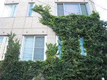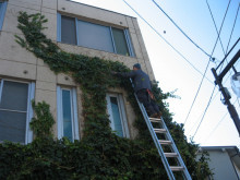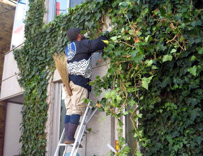 ビルの壁面に這うツタ(アイビー)の取り外し作業をご依頼いただきました。今回は10mの2連梯子で慎重に作業します。アイビーは元気な植物でしっかり根を張りながら、壁面を登って行きます。その根は強力ですので、お手入れをしてアイビーを剥がすと、根の跡が残ってしまいます。壁面は根がモルタルのひび割れた隙間に入り込んでしまい、モルタルを剥がしてしまう危険があります。しかし壁面に緑があるのは見る人の心を和ませてくれます。植物と建物が気持ちよく共存できるようにしていくことが大切ですね。