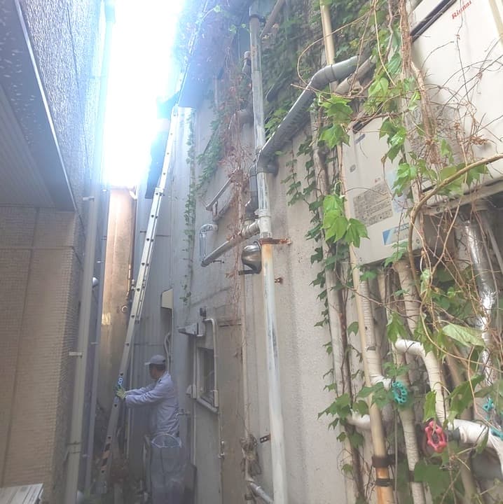 壁づたいに伸びてしまった蔦を除去する作業に行ってきました。まだ屋上近くまで伸びてはいなかったので短時間で作業は済みましたが、上までいってしまうと後々大変なので除去をお考えになられる際はお早めに。