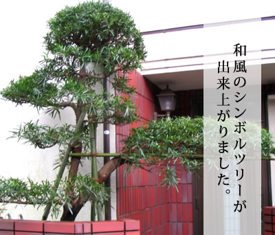 木の転倒防止と、風などで木が揺れ細根が切れるのを防止する為に、竹で支柱をして完成です。しっかりと根付いて、成長してくれることをくれることを願うばかりです。松やマキに代表される、人の手で仕立てされた樹形は日本の文化です。風格があり、年を重ねるごとに味が出てきます。人と一緒ですね。