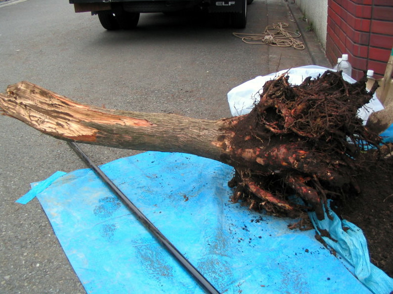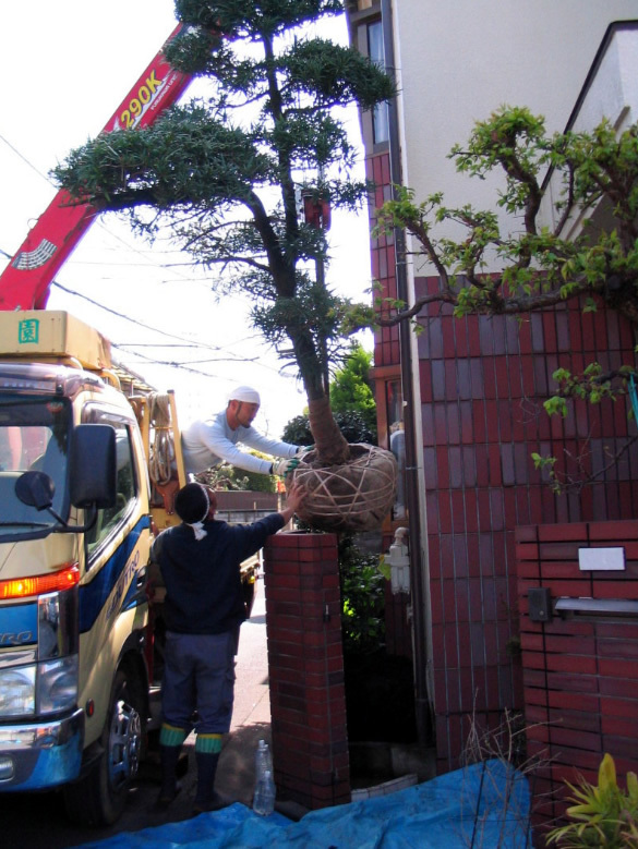 まずは、伐根です。今回の伐根は、幹が太く根がしっかりしていたので、時間を要しました。寸法を測り、枝ぶりを確かめ、上手くその土地に馴染む木を選び、植え込みます。木が大きくなれば、その分根も大きくなり、かなりの重量になります。