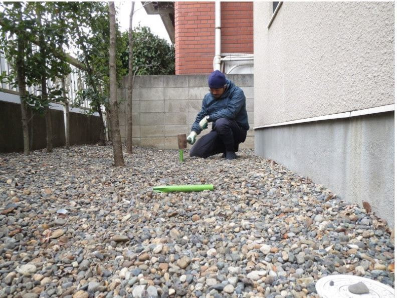 砂利の場合、パイルを打ち込むこともあります。樹木の生育に欠くことのできないチッソ、リンサン、カリを含む肥料の入っているパイルです。