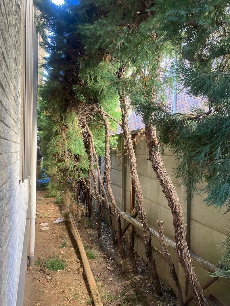 建物と塀に挟まれた細い通路に並ぶ樹木。それぞれに支柱を設置。
