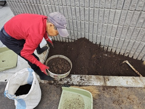 土の中に石が沢山あるので、取り除きました。スコップで土を掘り起こし、ふるいで除きます。土質が悪化しても、石を除き、腐葉土を混ぜるだけで土は蘇ります。