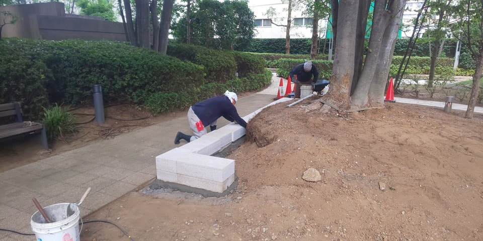 土が漏れないようブロックを積み、土留めをしました。花壇は土砂を防ぐ役割もございます。