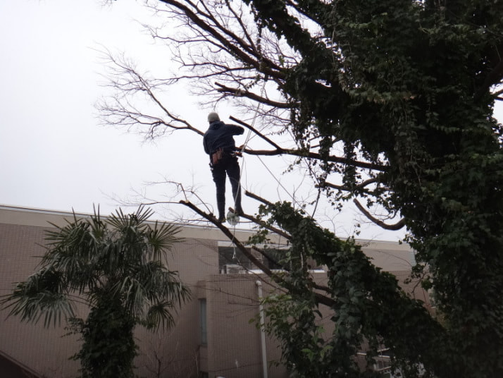 ツリークライミングの技術を駆使し、安全に作業をします。