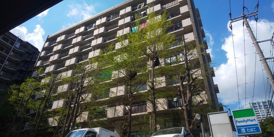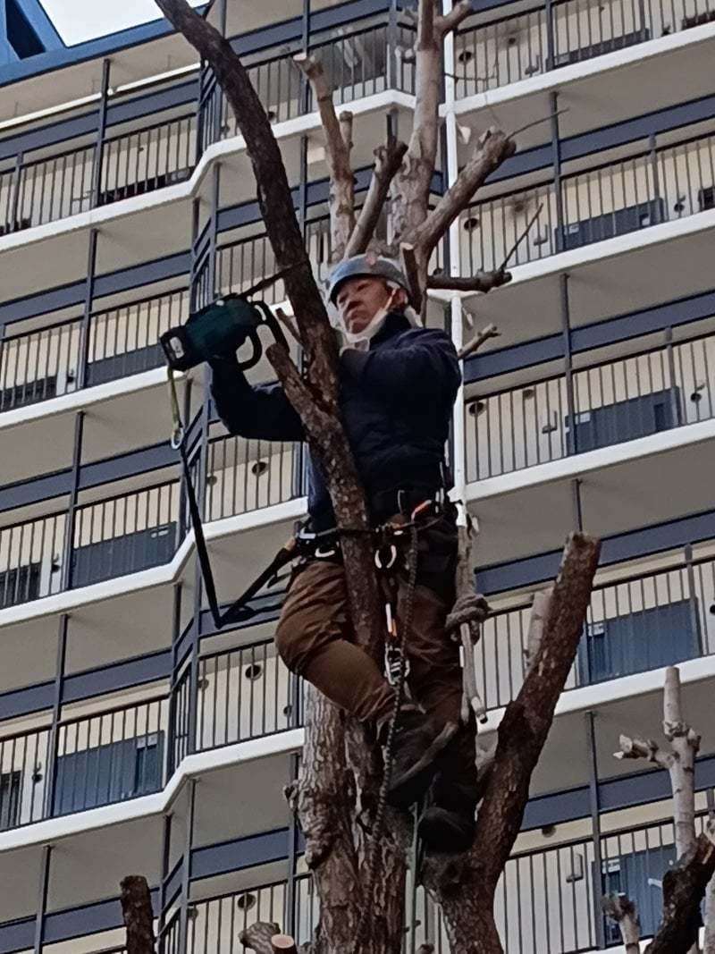 建物6階くらいまで伸びています。高さ20mある銀杏なので、ツリークライミング技術で安全に作業しました。