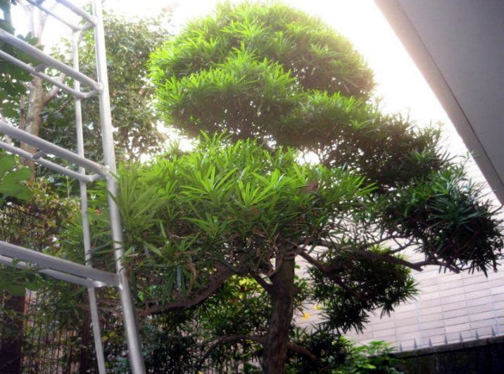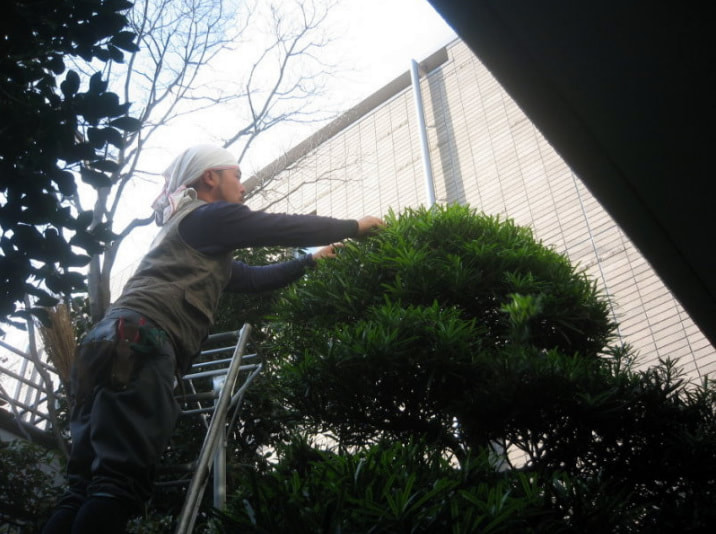 こちらは、コノテガシワのお手入れのご依頼です。今回は、電動のトリマーを使い、刈込み鋏で仕上げます。