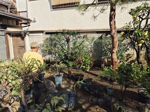 年末間近、お庭のお手入れ。作業後に水打ち作業。植木や土にたっぷりとお水を含ませ、庭石や、飛び石にも水打ちです。行われたあとの景色は、見た目にも清涼感があります。