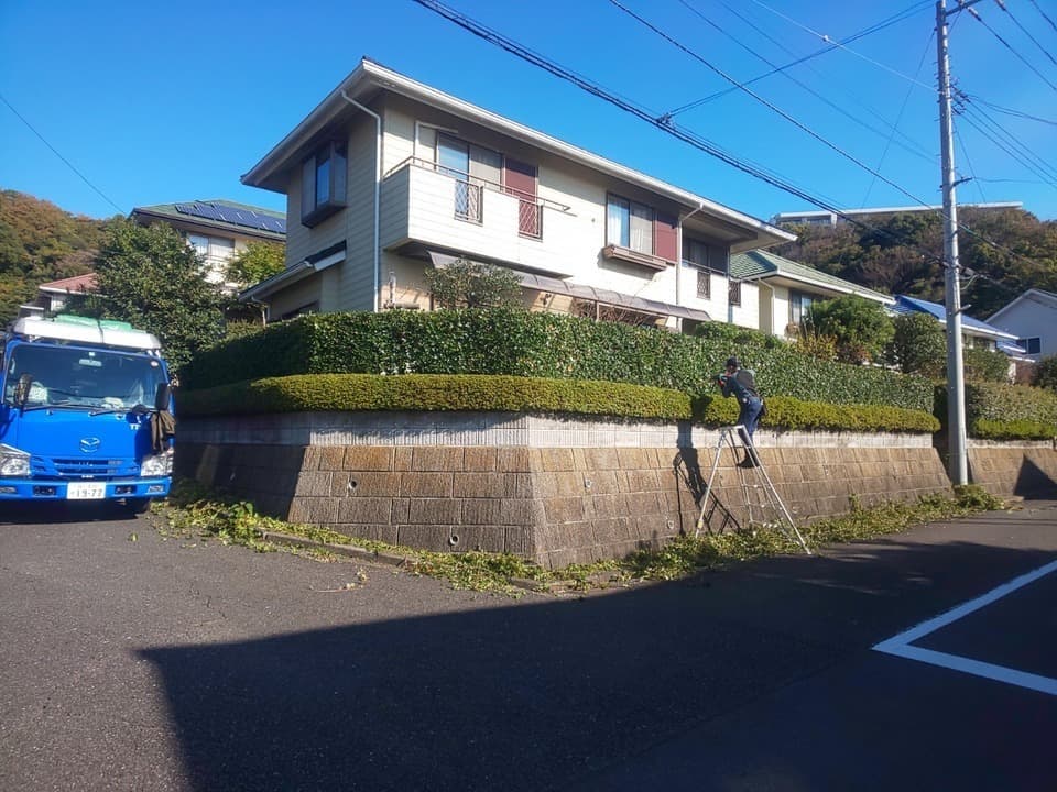 ウバメガシ、サツキの刈込剪定のご依頼です。元気良く伸びるので、電気バリカンで刈り込みました。さらに電気バリカンのあと、刈り込み鋏で丁寧に手直しします。